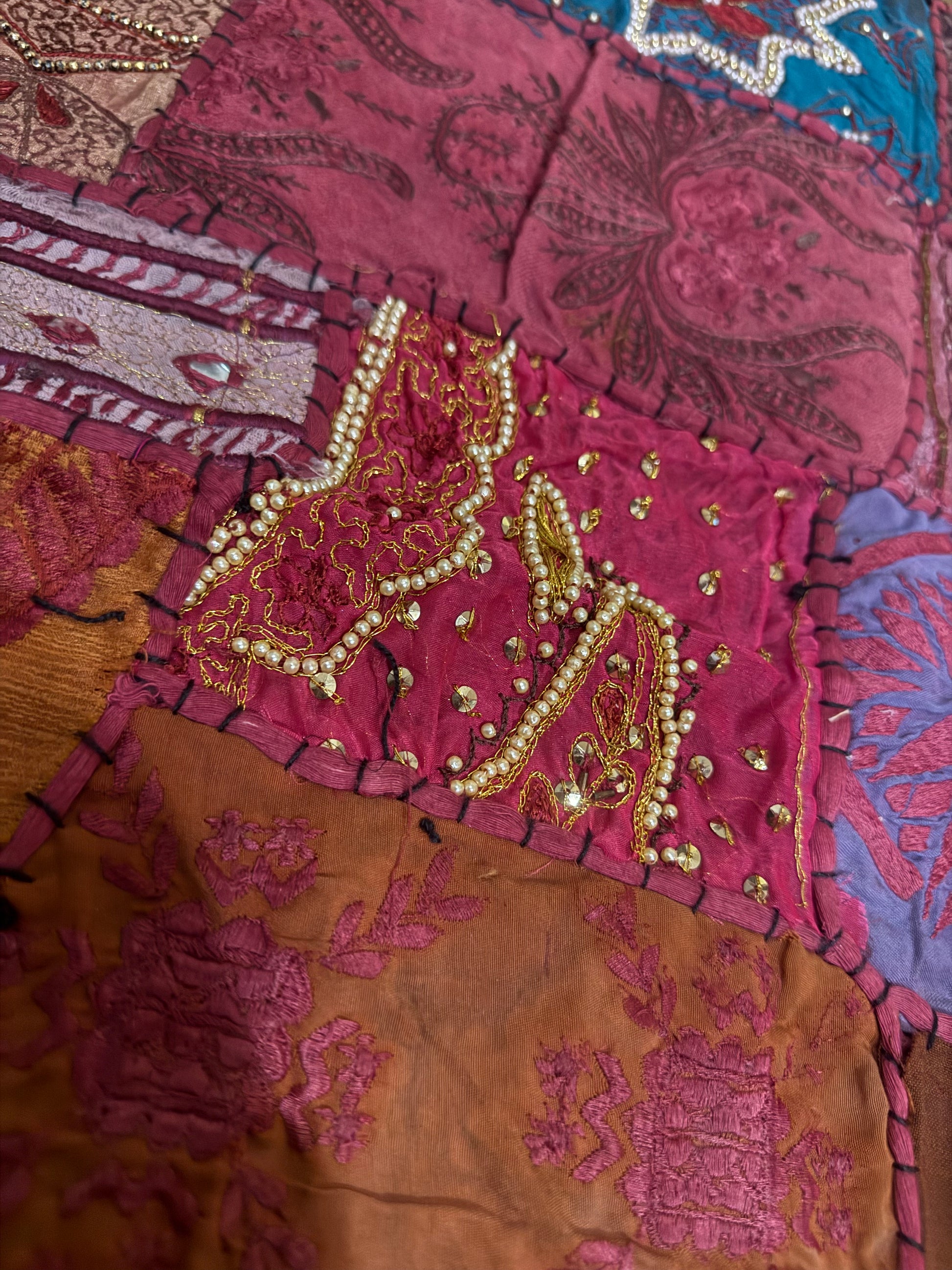 Materials – Cotton blend, sequins, beads, zari thread, lace, and vintage sari fabric patches.