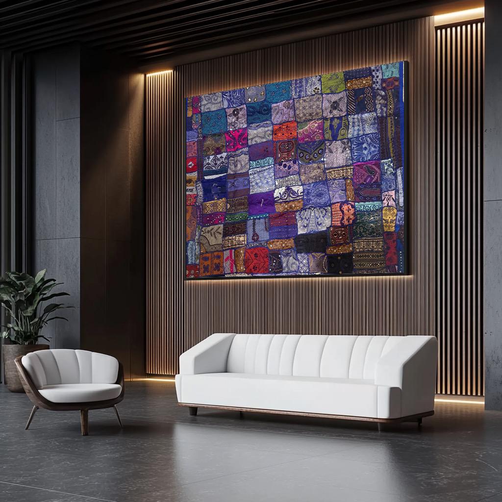 Upcycled Tradition – Each tapestry repurposes old fabrics into new works of art, reducing waste while preserving heritage.