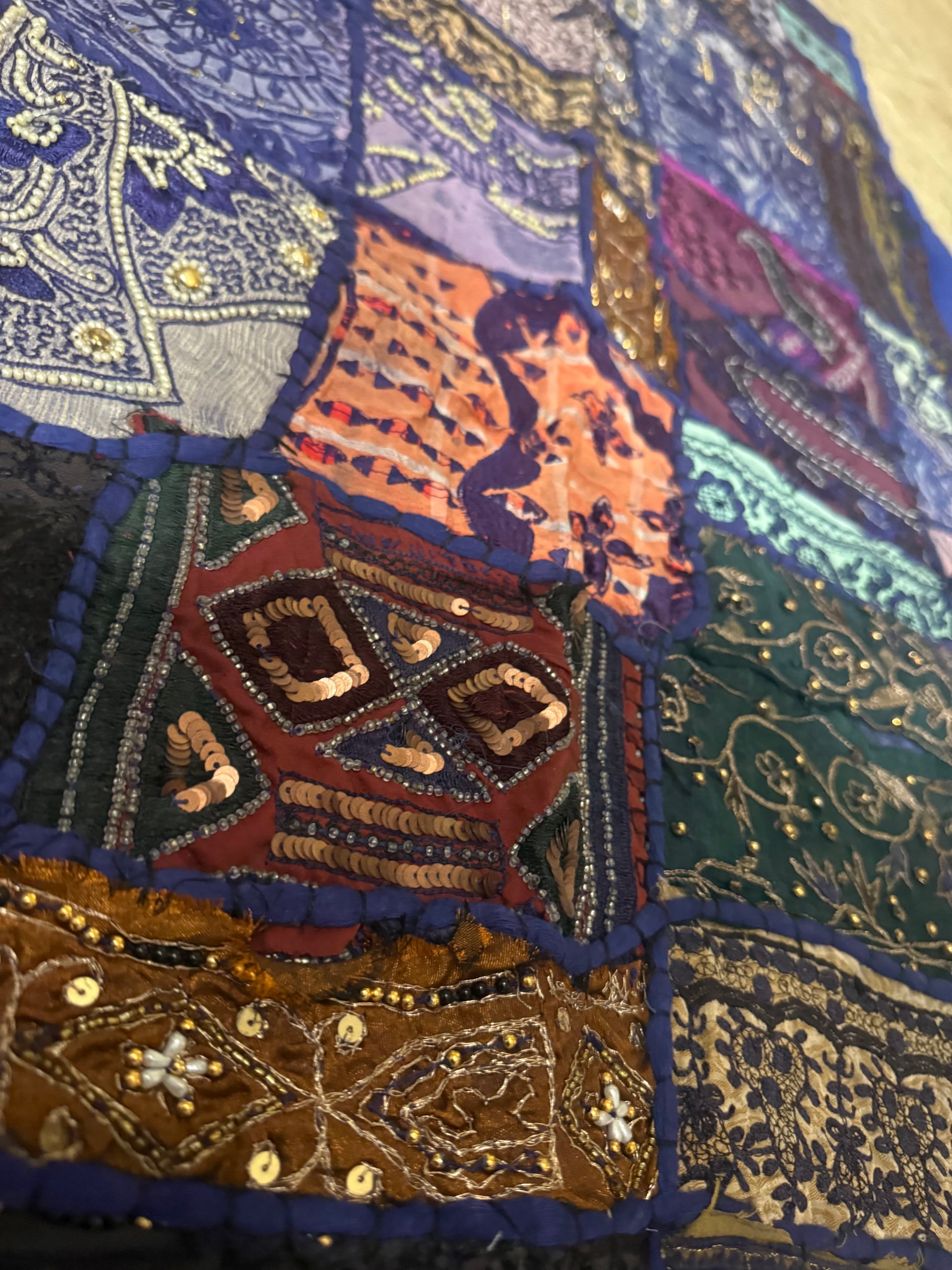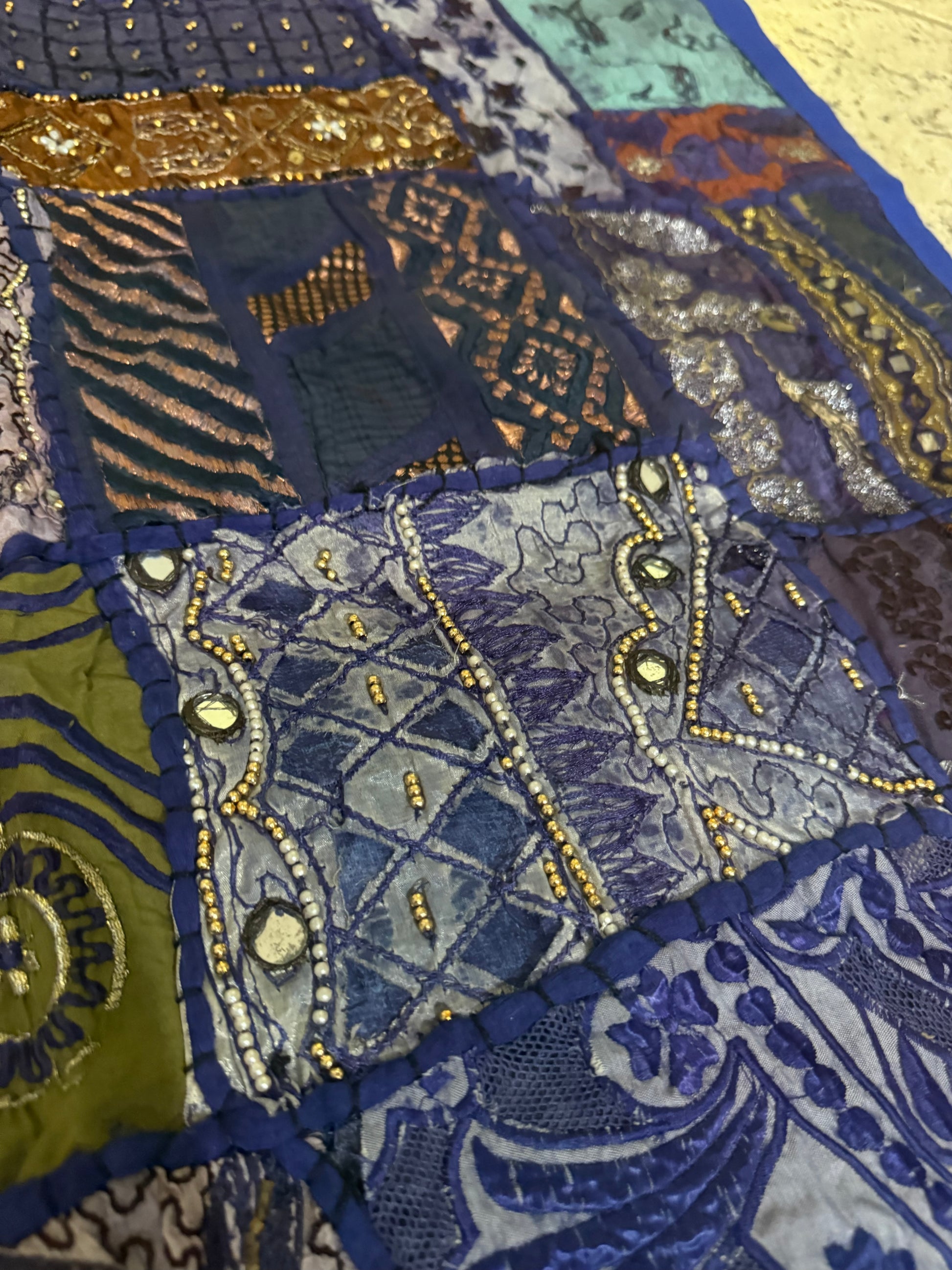 Materials – Cotton blend, sequins, beads, zari thread, lace, and vintage sari fabric patches.